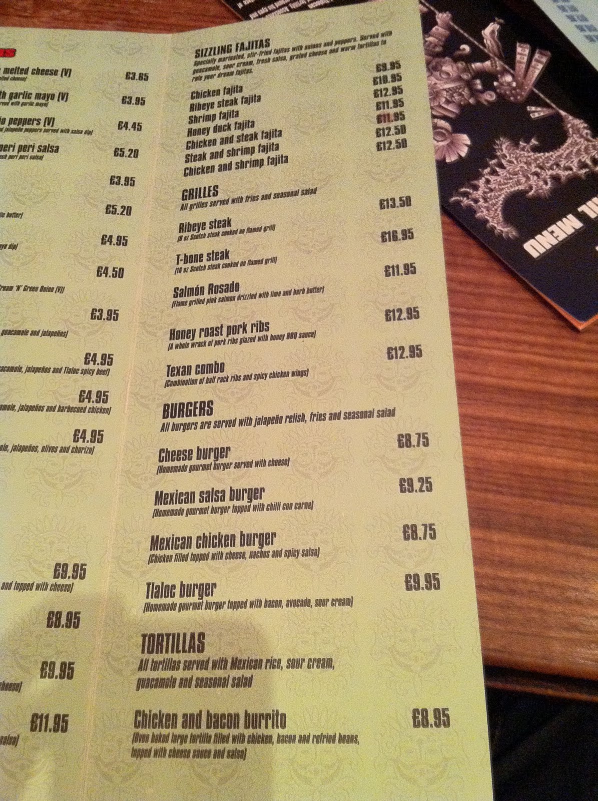 I've never gone from wilful optimism to pale-faced dread as quickly as when I sat down and read through the Tlalocan menu. BBQ chicken wings, Tex-Mex potato skins, three very uninspiring types of tacos, "sizzling fajitas", some suspiciously inexpensive steaks, a variation on the theme of burger, and a chicken and bacon burrito. It felt like a lazy, populist pub menu, the kind of thing you'd find in any chain bar in any high street in Britain, and hardly the level a new independent Mexican restaurant opening in 2010 should be aiming for. Nowhere deserves another Cantina Laredo, but surely firstly Wahaca and more recently Lupita (an inexpensive and I'm told pretty decent new place near the Strand) have done enough to prepare Londoners for the reality of proper fresh Mexican food? We can cope with more than a sweet margarita and a plate of nachos, can't we?