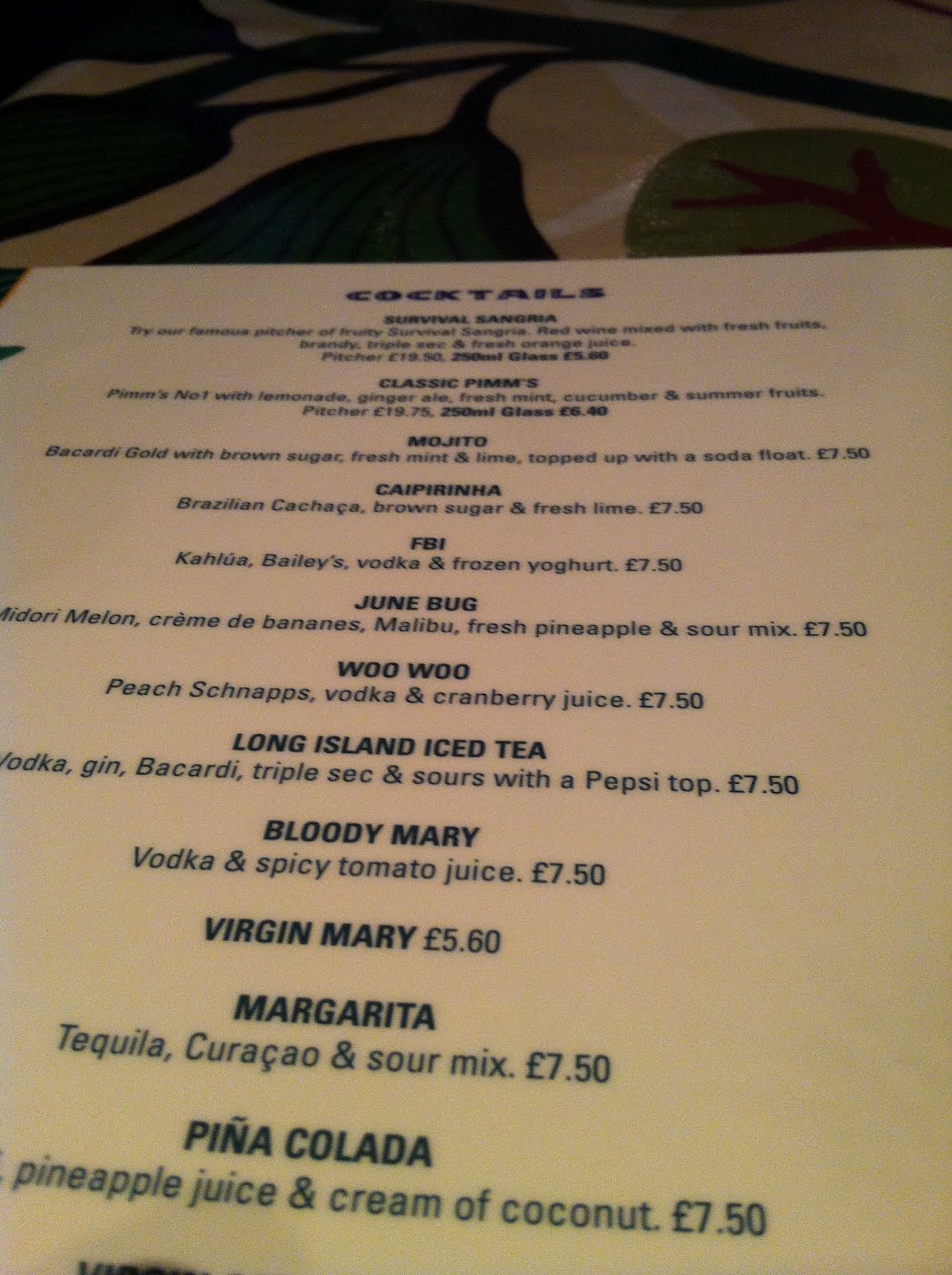 Ah yes, the bill. The food was poor and expensive but the real sting in the tail of last night was some truly eye-watering mark-ups on alcohol. A teeny 125ml glass of watery house chardonnay was £5, and a bottle of 3.8% Carlsberg was an incredible £4.50 - that's more than the cost of a pint of export-strength lager even from a West End pub. And perhaps we could have gone a little easier on the booze but you try having a meal in the middle of a dusty fiberglass rainforest and see how long you can last before gasping for a drink. Each of the adults had one main course, shared a portion of mediocre chicken wings and had 4 drinks each and managed to spend £50 a head. As we paid up and left, I couldn't help noticing how the shrieks and hoots of recorded jungle noises increasingly sounded like jeers and mocking laughter.