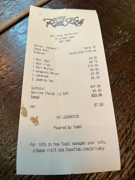 So yes, it would have been nice to have had a bit more elbow room, and the morning glory wasn't perfect, but the rotis were lovely, we had more than enough food, and the bill for 3 people (with jasmine tea and a lemonade) came to £53.55 including service. So we couldn't have wanted for much more, really. Roti King Battersea stands as proof that you can expand from a tiny basement spot in Euston to a multi-billion-pound Malaysian-backed development south of the river and not lose your heart, soul or sense of value. And for that, we should all be grateful.